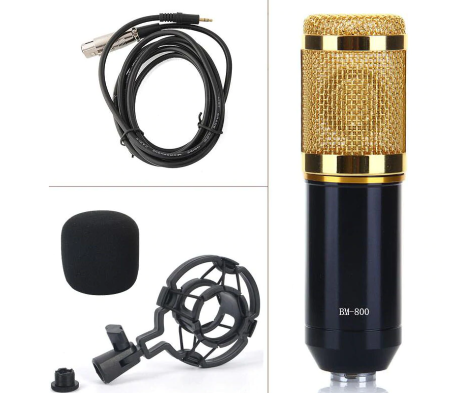 Microphone, sponge ball, bracket, shock mount, audio cable, USB sound card